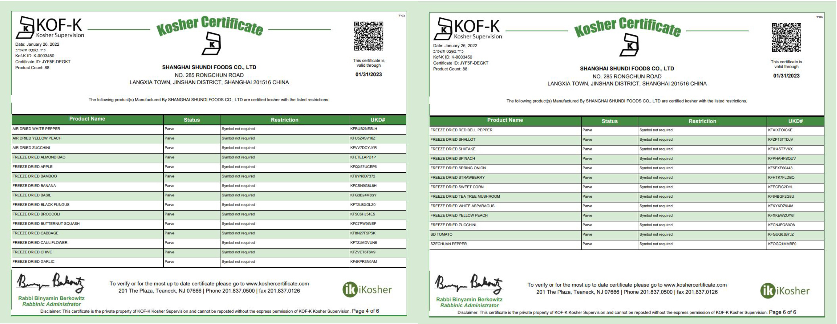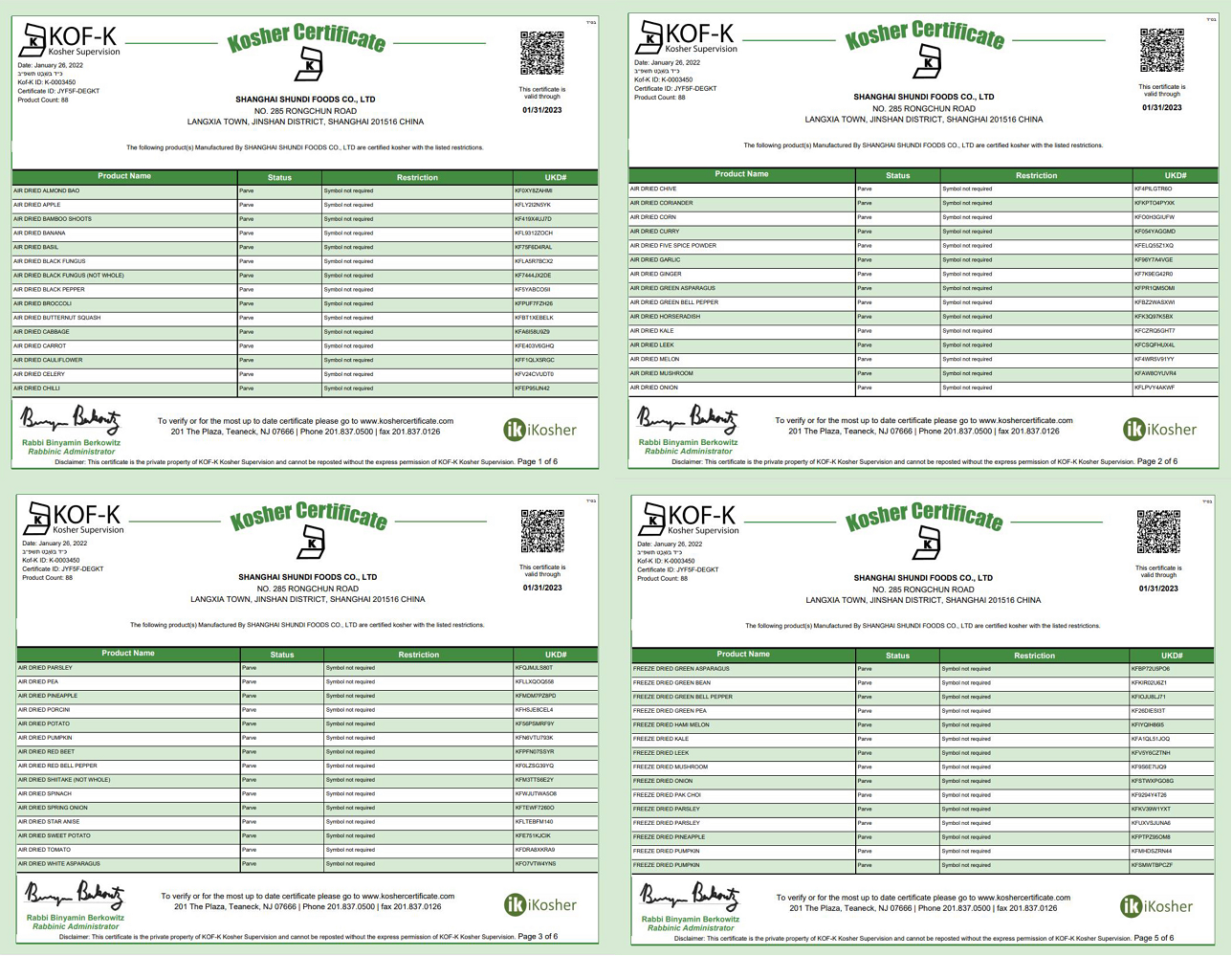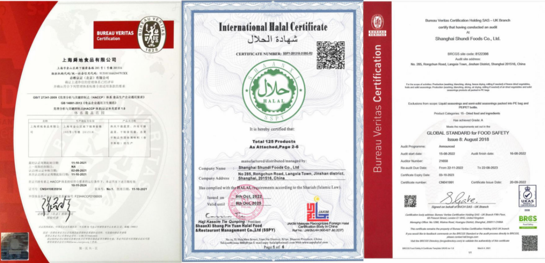 舜地食品持有(haccp)食品管理体系认证、成绩为a级的brc证书,并且加入了sedex、kosher、halal协会。