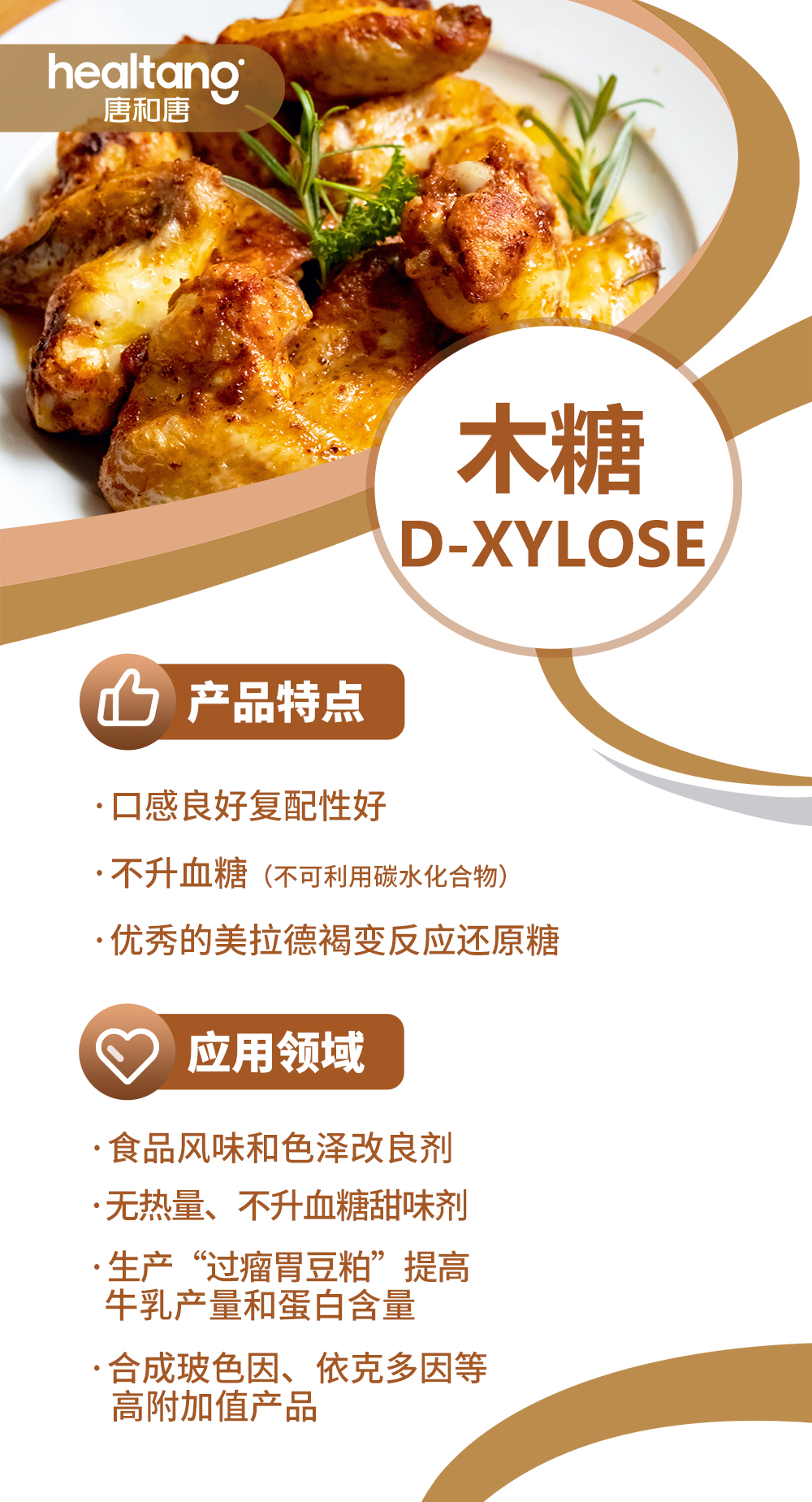 木糖是以玉米芯、木质等植物为主要原料提取得到的一种天然糖,甜味纯正、无热量、复配性好,与常见的葡萄糖、蔗糖相比,有更优秀的美拉德反应效果,广泛用作无热量、不升血糖甜味剂,食品风味剂和色泽改良剂,生产“过瘤胃饲料”、木糖醇、化妆品原料等高附加值产品。