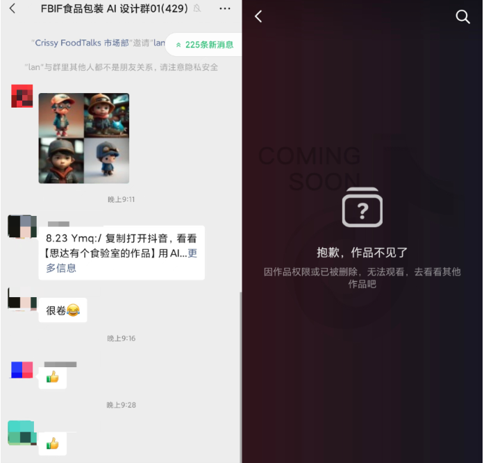 随后,在食品包装ai设计交流群中,有群友分享了孙思达发布的抖音,视频里展示了孙思达通过midjourney设计包装的过程,但不久后该视频下架了,这给该款ai设计的产品带来更多的神秘感。