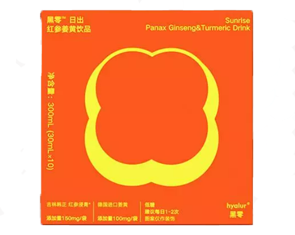 与红参搭配,由华熙生物九游会的旗下品牌黑零推出的日出红参姜黄饮,主打提振精神、保持精力、辅助增强记忆等 |