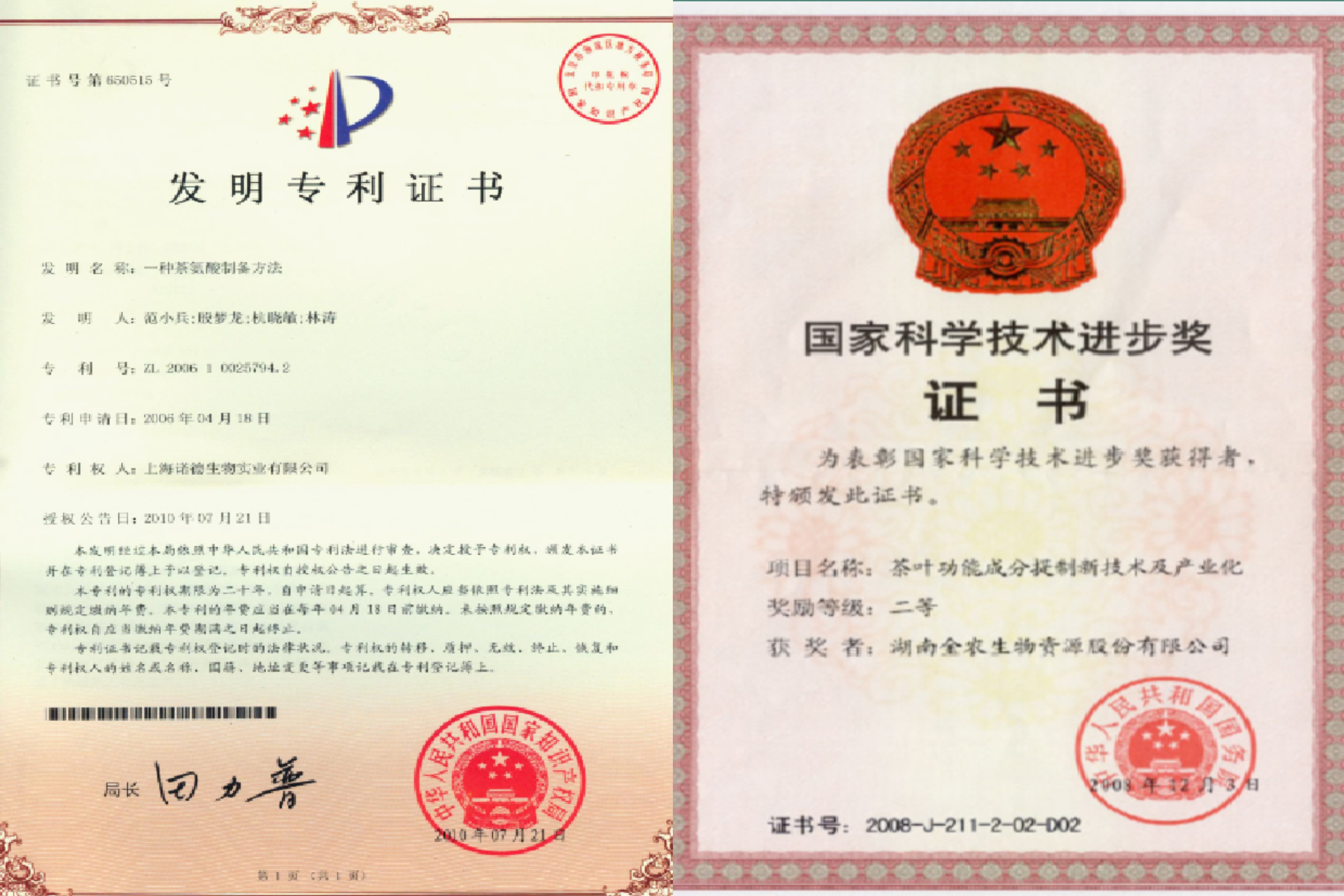 茶叶茶氨酸是依照诺德的方法发明专利(专利号:zl200610025794.2)直接获得的产品。湖南金农“茶叶功能成分提制新技术及产业化”项目曾在2008年获得国家科学进步二等奖。