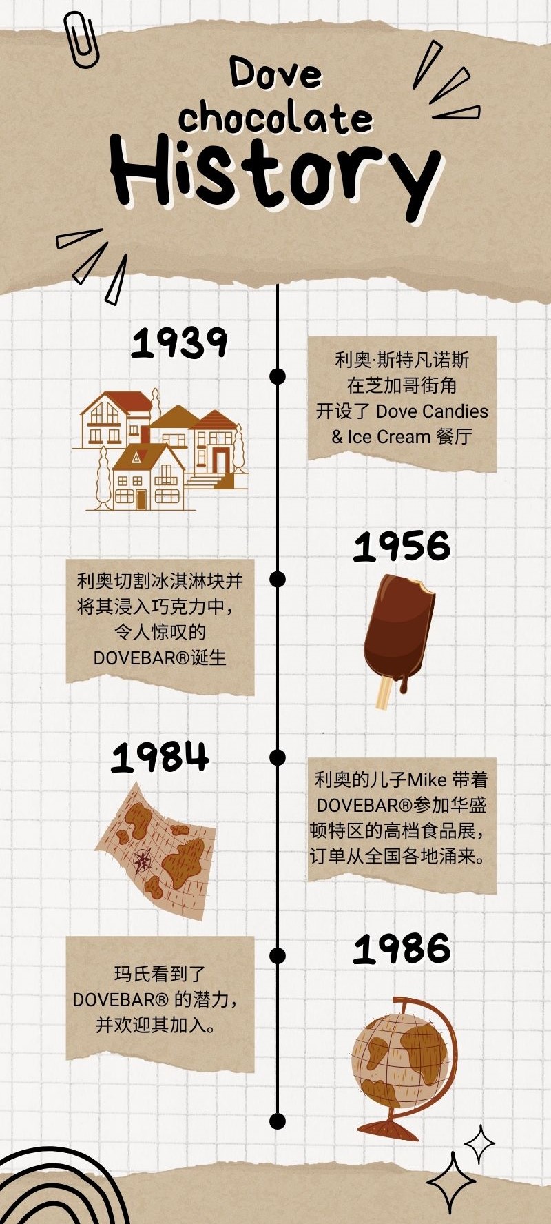 1939年,希腊裔美国人利奥·斯特凡诺斯(leo stefanos),在芝加哥街角开设了一家名为dove candies & ice cream的餐厅;1956年的一天,利奥看到他的儿子迈克(mike stefanos),在一条繁忙的街道上追逐一辆冰淇淋车,他决心创造一种美味的新冰淇淋,让人们可以在自己的店里安全地享用。经过数月的研究,他精心切割冰淇淋块并将其浸入巧克力中,令人惊叹的 dovebar®由此诞生。
