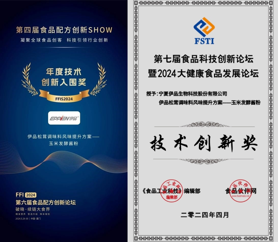 在ffi2024第六届食品配方创新论坛、第七届食品科技创新论坛暨2024大健康食品发展论坛上,伊品以松茸调味料风味提升方案——玉米风味酱粉获得年度技术创新奖、年度技术创新入围奖。