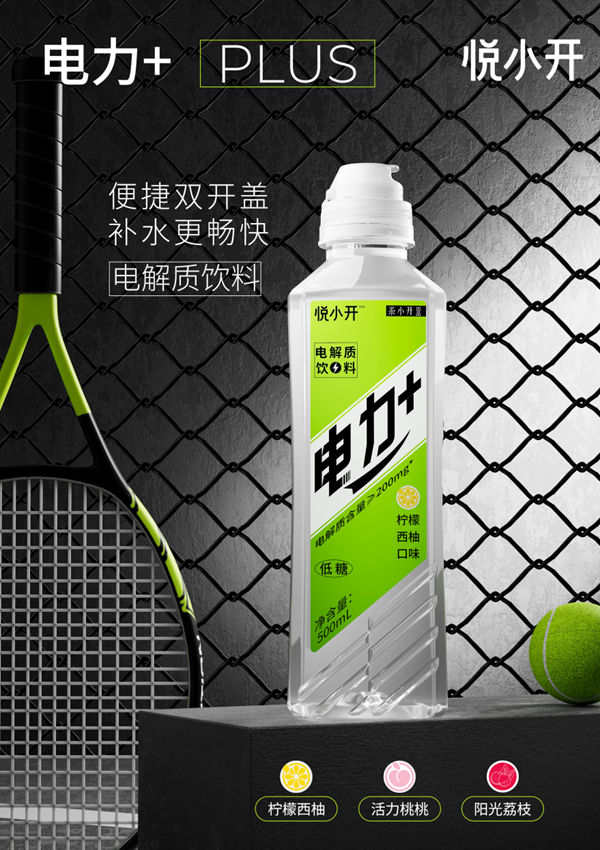 “电力 电解质水”系列产品包装采用便捷双开盖设计,电解质含量每瓶大于200mg。拥有柠檬西柚、活力桃桃、阳光荔枝三个口味,适合运动暴汗后饮用,帮助快速补充体力。