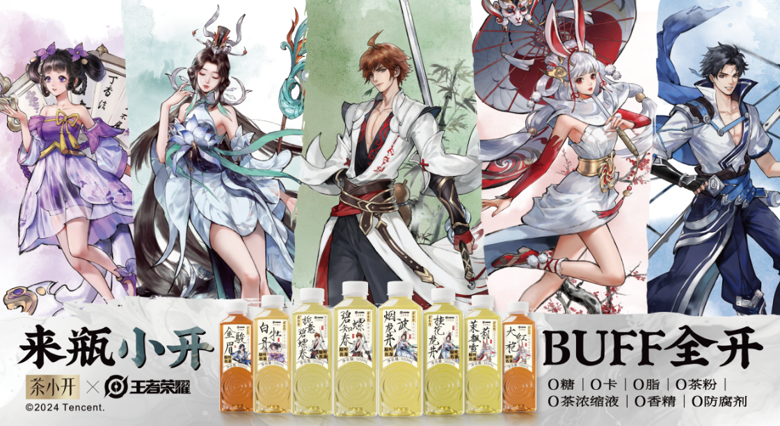 2024年10月,茶小开品牌携手腾讯手游王者荣耀,融合传统茶韵与现代游戏,推出了合作款包装产品,包装上的ip形象包括王者荣耀的热门英雄李白、大乔、公孙离、小乔和曜。此外,此次联名也推出了合作款周边,包括五款水墨风的鼠标垫,以及两款电脑桌垫。