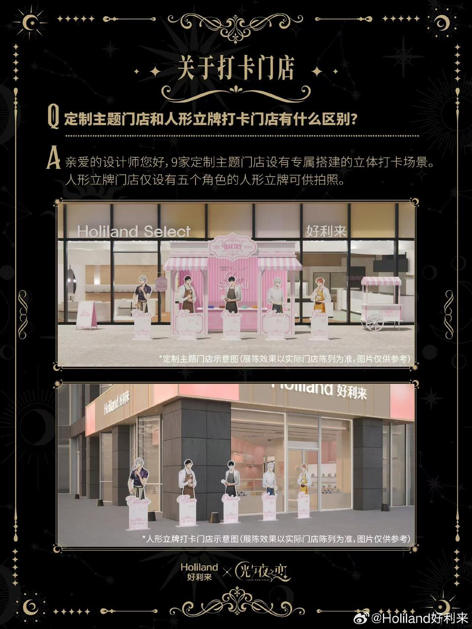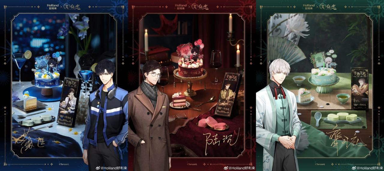 2024年7月,好利来联动光与夜之恋,推出了香橙酸奶、芋泥巧克力、茉莉香梨、树莓拿铁、海盐柠檬五款口味的半熟芝士产品,还有五款定制甜蜜生日蛋糕,同时在网络征集联名相关内容,参与活动的粉丝可获得蛋糕、半熟芝士、限定礼盒、浮梦夏日长系列泳装娃娃、角色收藏卡等产品和周边。