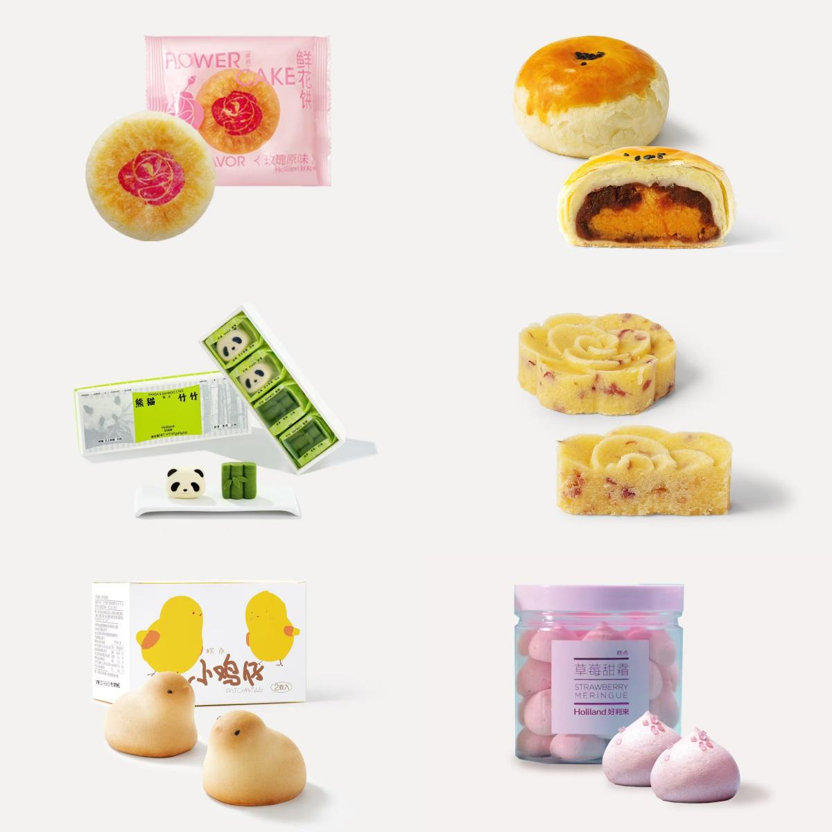 零食中点产品有line friends联名系列minini迷你连萌糕点,传统类糕点如鲜花饼、玫瑰蛋黄酥、玫瑰绿豆糕、锦韵茶糕等,还有北海道芝士牧场、熊猫竹竹、小鸡仔、甜霜等产品。