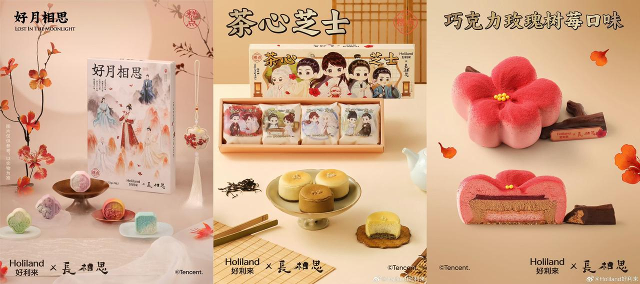 2024年7月至8月,好利来联名长相思,相继推出三波联名产品,包括内含蜂蜜紫米、奥巧芝士、芋泥芝士、海盐芝士和香橙芝士口味中点的糕点礼盒,伯爵红茶、醇香焙茶、正山小红和四季乌龙口味的茶心芝士,还有巧克力玫瑰树莓口味的“以爱相思”西点。