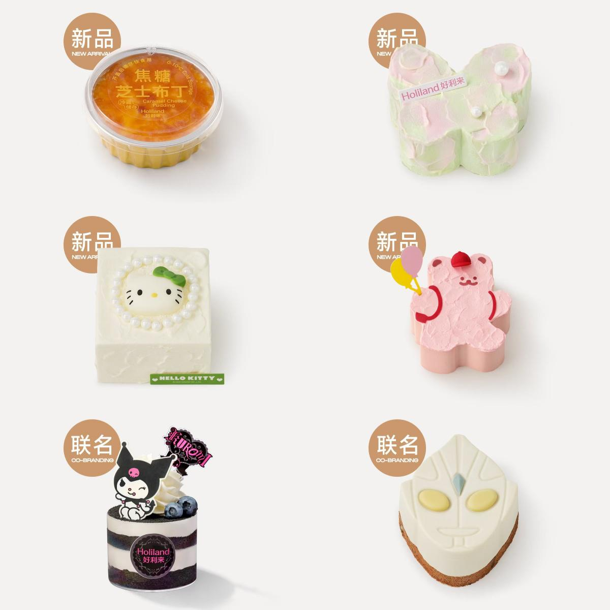 好利来西点类产品有焦糖芝士布丁,以及因为可爱外观吸引众多消费者打卡的巧了小熊、新品珍宝蝴蝶、联名款迪迦奥特曼、hello kitty合作限定珍爱宝贝、酷洛米恶魔杯等甜品。