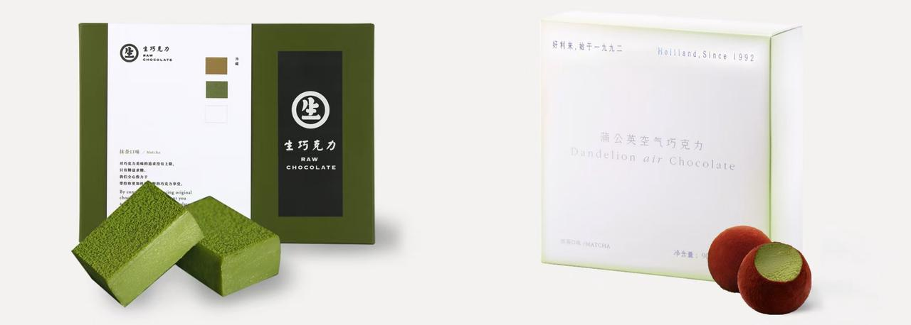好利来有生巧克力和蒲公英空气巧克力两款巧克力产品,皆有抹茶和巧克力两种口味可供选择。