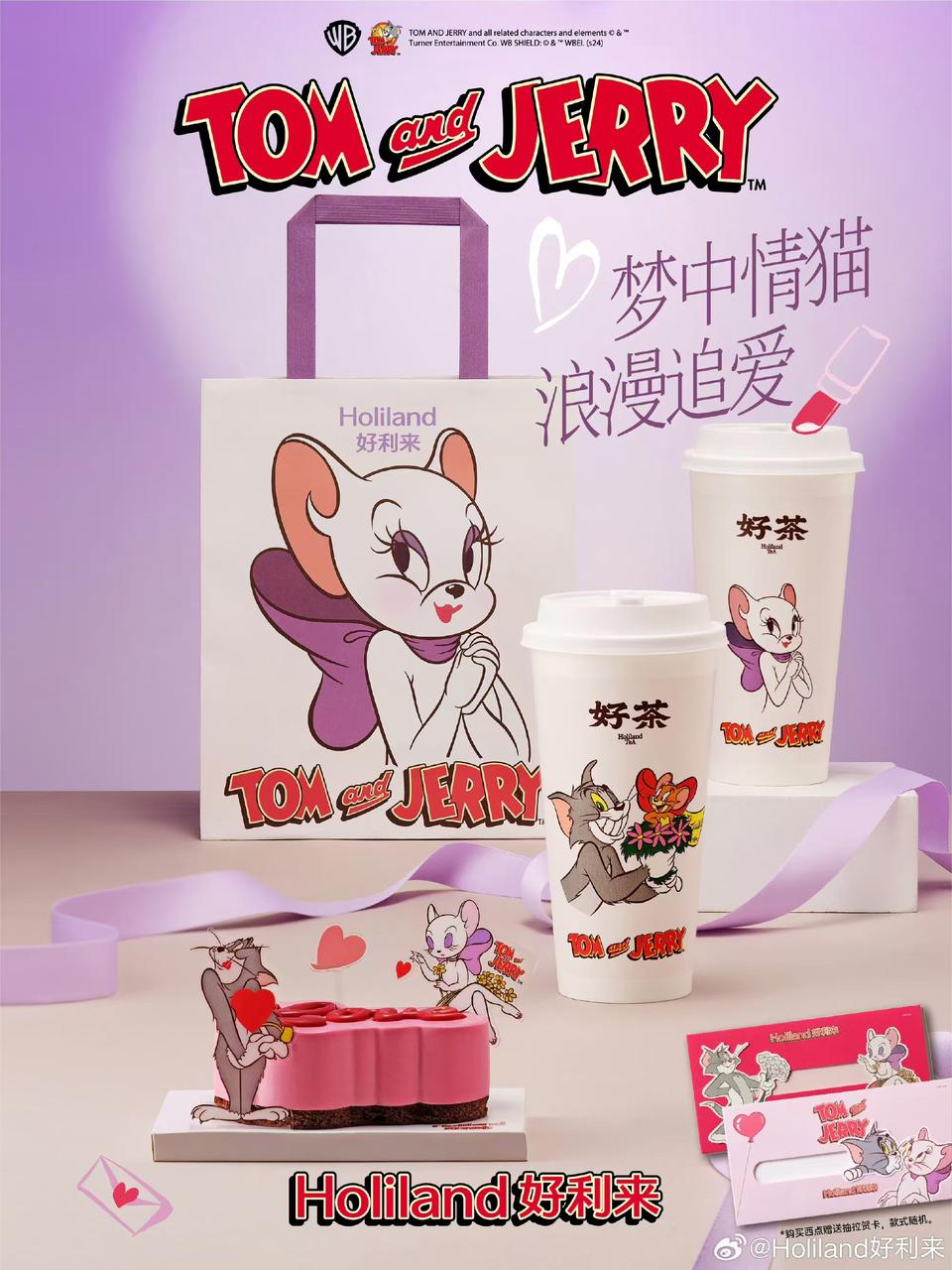 2024年8月,好利来推出了和猫和老鼠的联名产品,包含芝士玫瑰草莓口味的西点,还有“好茶”系列的铁观音乌龙茶芝士鲜奶茶。同时,购买西点还可以获得心意告白贺卡周边,线下门店总计发放11万张,赠完即止。