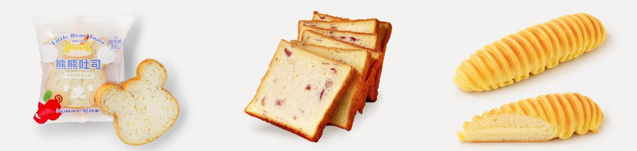 好利来包装面包有玫瑰切片吐司、不同口味和外观的卡通吐司、柠檬卡仕达奶油味的毛毛虫等。