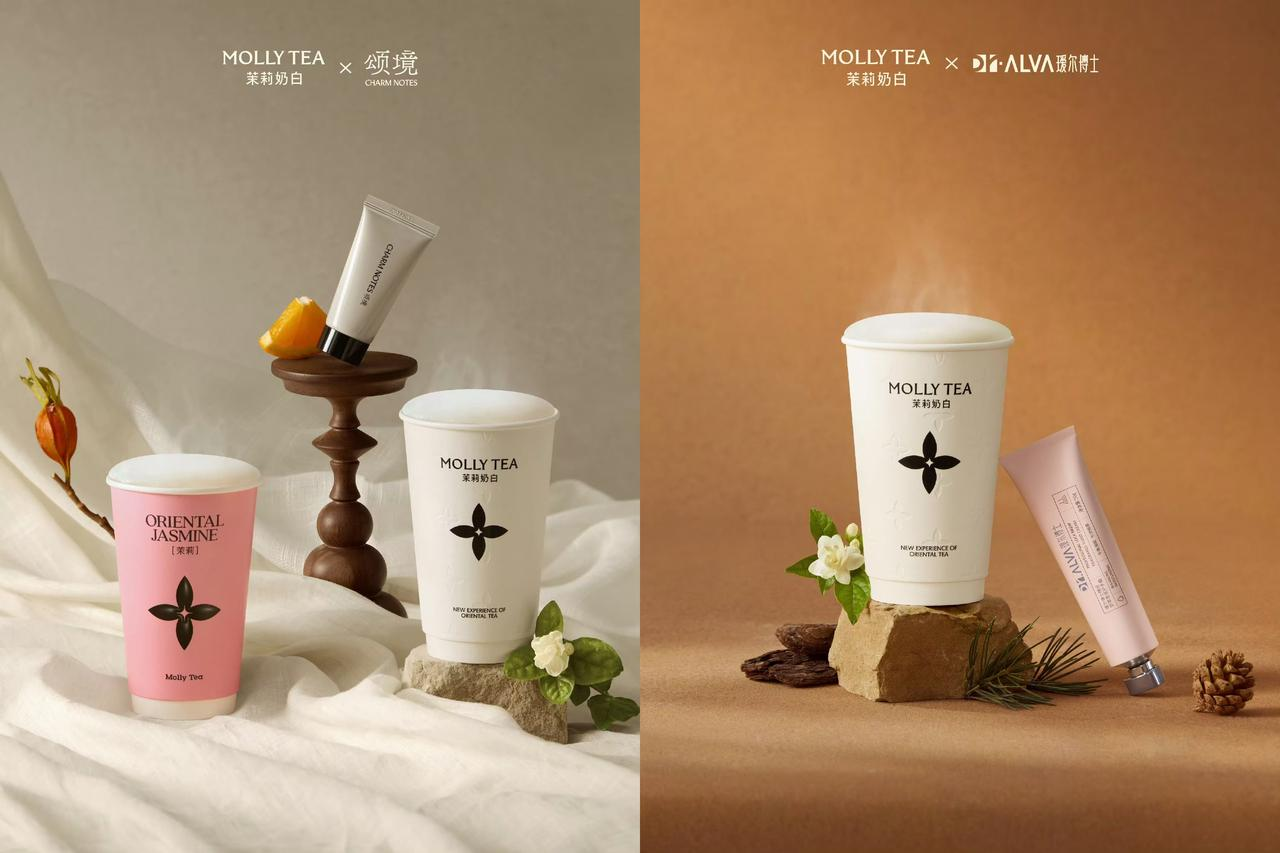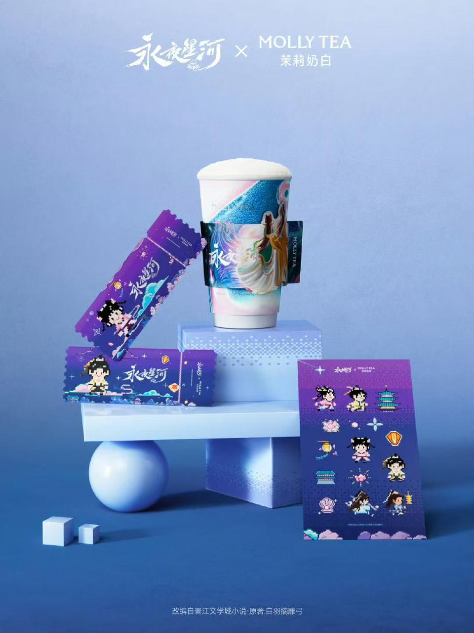2024年11月,茉莉奶白跨界联名热播古装剧《永夜星河》。系列联名饮品含蜜桃老铁、一口老铁、茉莉奶白和栀子奶白四款饮品,并推出了亚克力立牌、香卡、像素风纪念贴纸等复刻剧中名场面的周边,为粉丝带来了独特的互动体验。