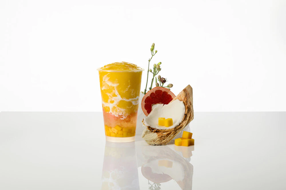 花香果茶系列的“茉莉杨枝甘露”,以茉莉龙芽为茶底,融入了冰爽绵密的芒果冰沙,并加入了香甜芒果和爆汁西柚,搭配顺滑椰乳,口感香甜、浓郁。西米晶球和寒天的加入,为饮品带来了丰富的咀嚼感。