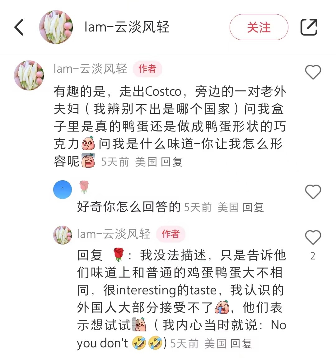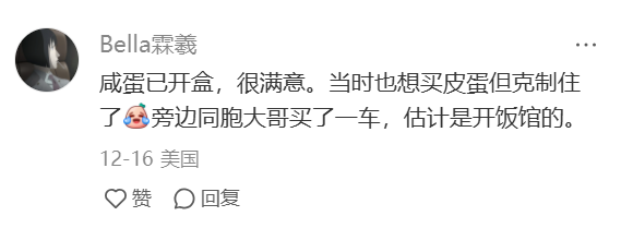 “旁边同胞大哥买了一车,估计是开饭店的”,一位ip美国的小红书用户在costco皮蛋的相关帖子下评论道。