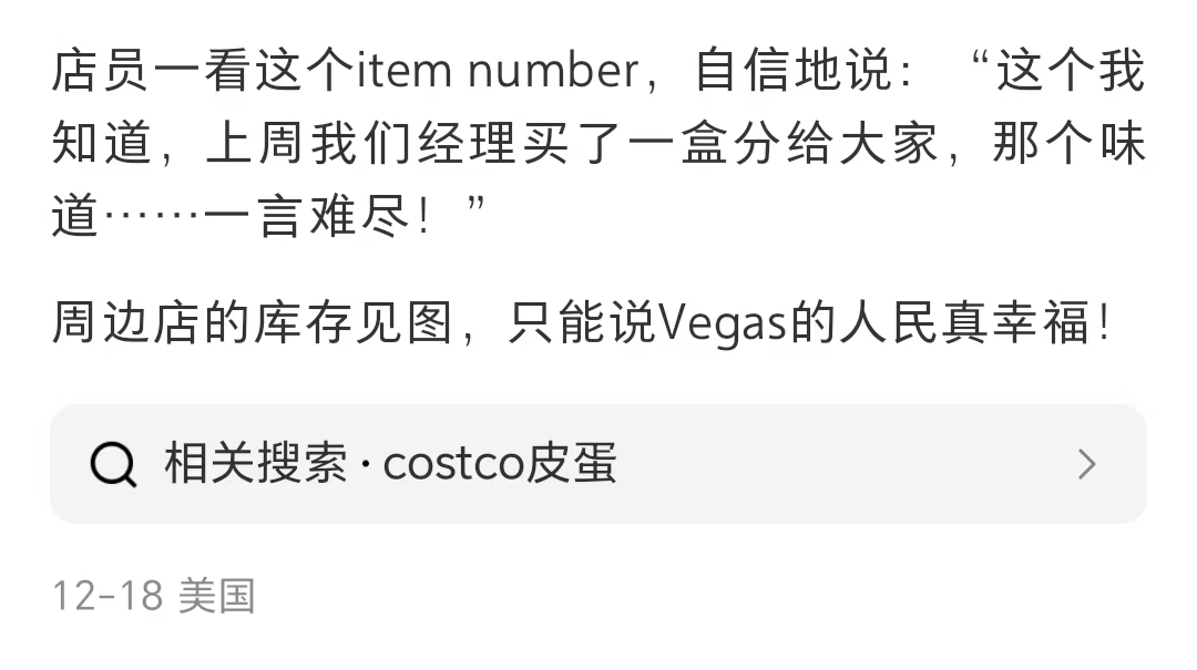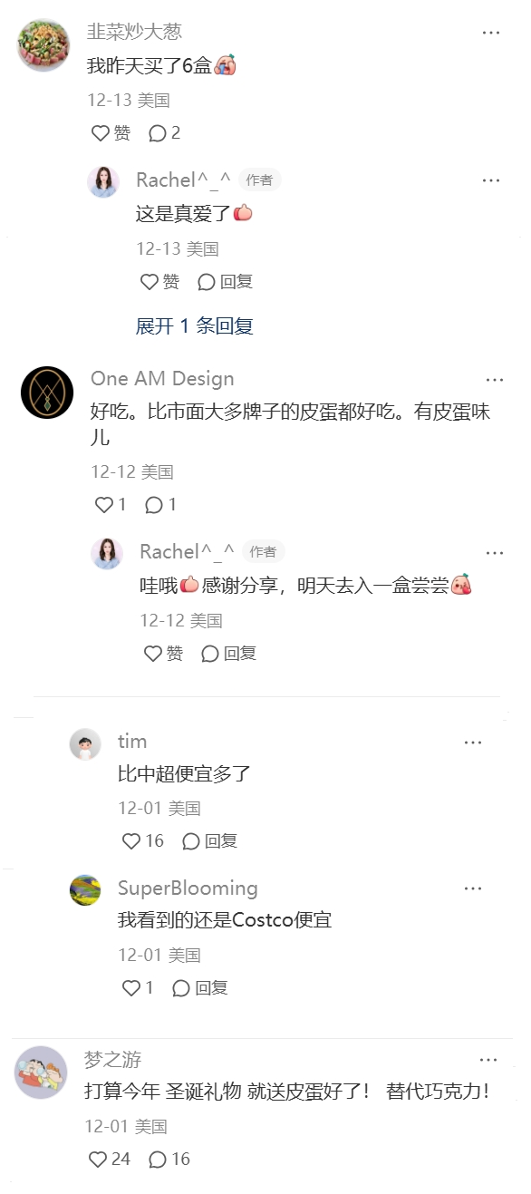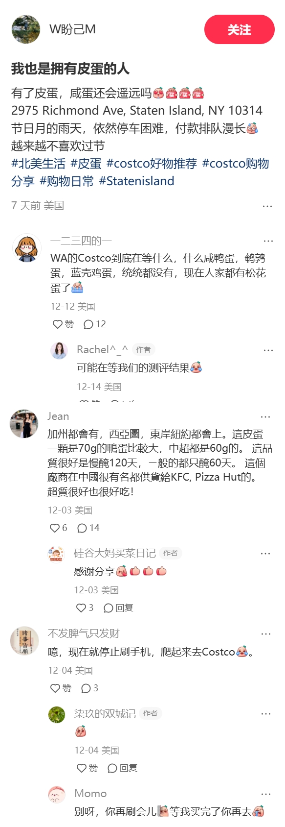 行动力强的同胞看到信息后,更是直奔附近costco,有的一周要转好几个costco。找到皮蛋的用户欢天喜地报出新的坐标,“我也是拥有皮蛋的人”;没找到的在评论区抱憾刷评,问自己这边的costco能不能上架?有的甚至还得到了疑似内部人士的反馈。