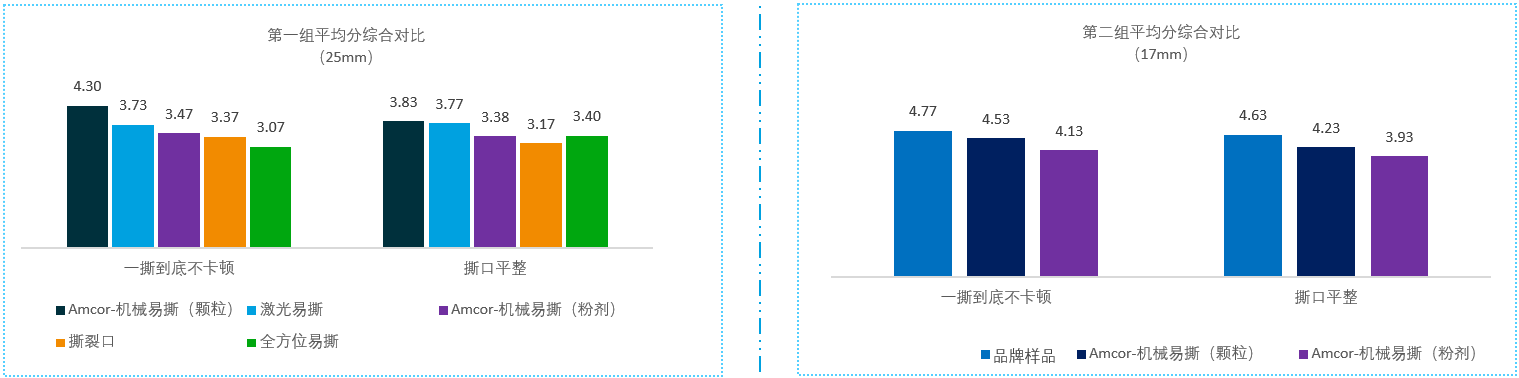 针对不同尺寸的易撕包装产品,安姆科测试了市面上有代表性的条包产品和安姆科粉剂与颗粒条包样品。结果显示,升级后的易撕条状包装在“一撕到底不卡顿”和“撕口整齐”的评分表现良好。