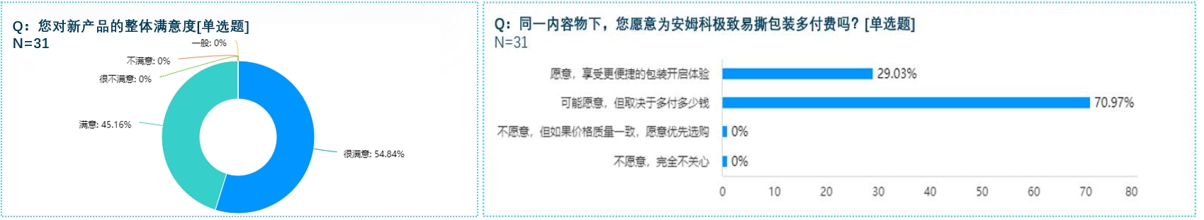 尤其17mm尺寸颗粒易撕条包获得了一致好评,超过半数受访者表达了极高的满意度。同时,大多数受访者表示愿意为安姆科极致易撕包装多付费,其中有70.97%的受访者可能愿意,并表示取决于多付多少钱。