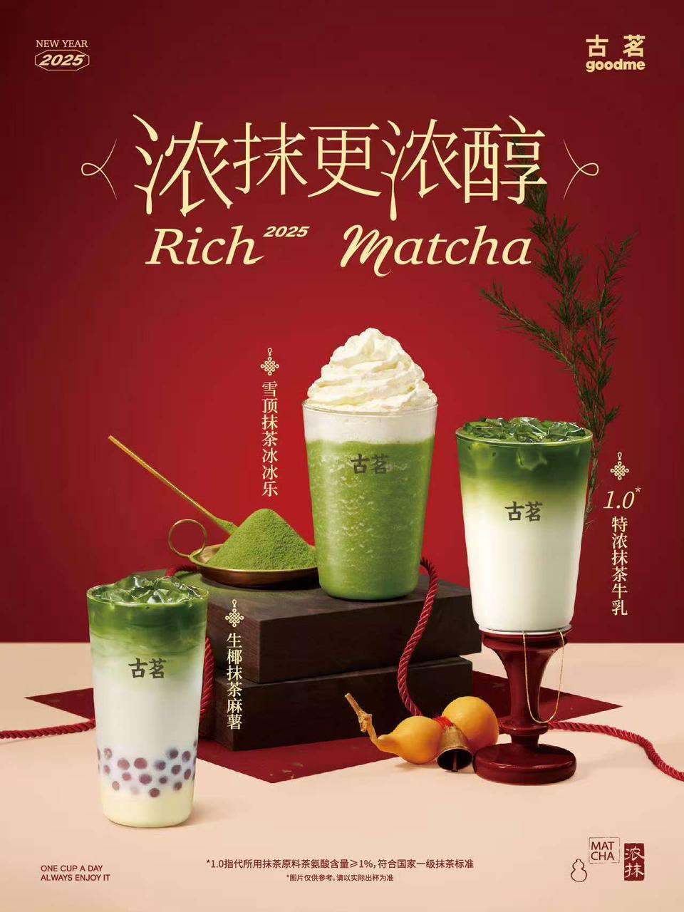 2025年1月,古茗推出了特浓抹茶系列产品,包含雪顶抹茶冰冰乐、生椰抹茶麻薯和特浓抹茶牛乳,各有特色。该系列甄选浙江抹茶,茶氨酸含量≥1%,符合国家一级抹茶标准,风味浓郁。