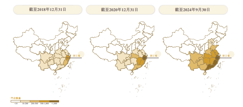 自2010年第一家店从温岭大溪镇起步,古茗便以“小镇包围城市”的策略迅速打开局面——从台州乡镇延伸到市区,再辐射浙江全省。浙江市场做透之后,古茗于2013年进一步攻城略地,向江苏南部、江西东部、福建北部等区域扩张。到2023年,古茗有79%的门店位于二线及以下城市,这一比例在2024年前三季度已提升至80%。