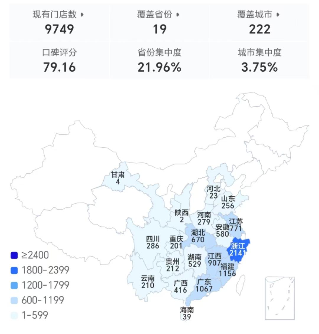 2014年,古茗拥有100家分店,2017年突破1000家,2021年增至5000家,而截至2024年9月30日,古茗已在全国开设超9700家加盟门店,在新茶饮门店数量上排名第二,第一为蜜雪冰城,约4.5万家店。如今,根据窄门餐眼,古茗的门店覆盖浙江、福建、江西、湖南、广东、湖北、重庆、四川等19省、200 个城市。[3]