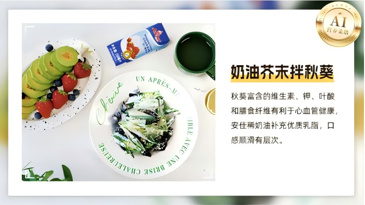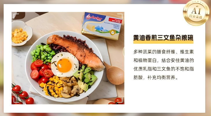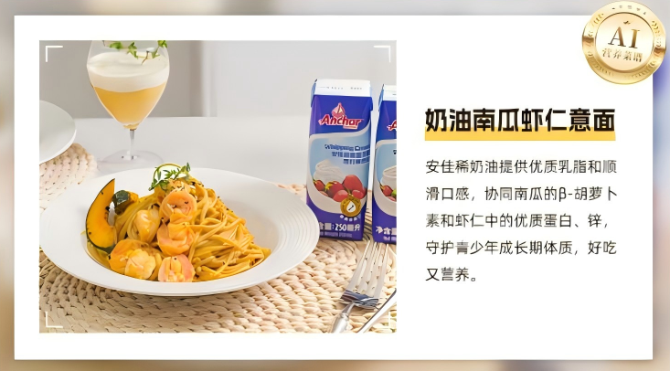 奶香丝滑的黄油香煎三文鱼、口感细腻的法式奶油炖鸡、香甜可口的奶油南瓜虾仁意面......一道道使用安佳草饲黄油、稀奶油等佐餐乳品制成的营养美食,在ai营养定制的助力下,正逐步走进更多中国家庭餐桌。