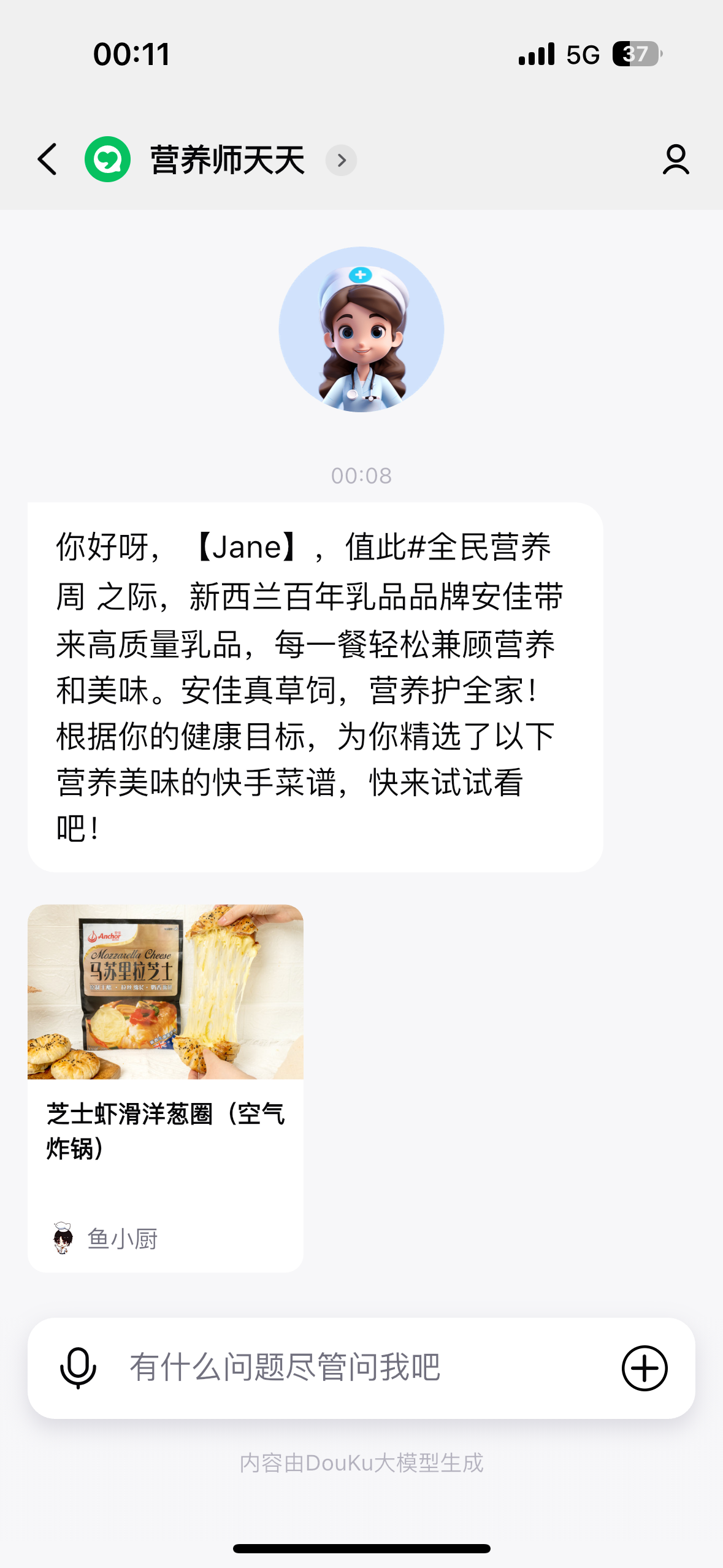 针对儿童及青少年成长、家庭及职场人营养保障、银发健康的不同营养需求,豆果ai模型根据佐餐乳品蛋白质、脂肪酸、维生素、矿物质等营养价值,设计定制化ai营养菜谱;而ai营养师则在与用户的对话中,让营养菜谱精准触达有需要的消费者。活动还邀请国家公共营养师,进行乳品营养科普,让更多消费者了解安佳佐餐乳品的“营养魔法”。