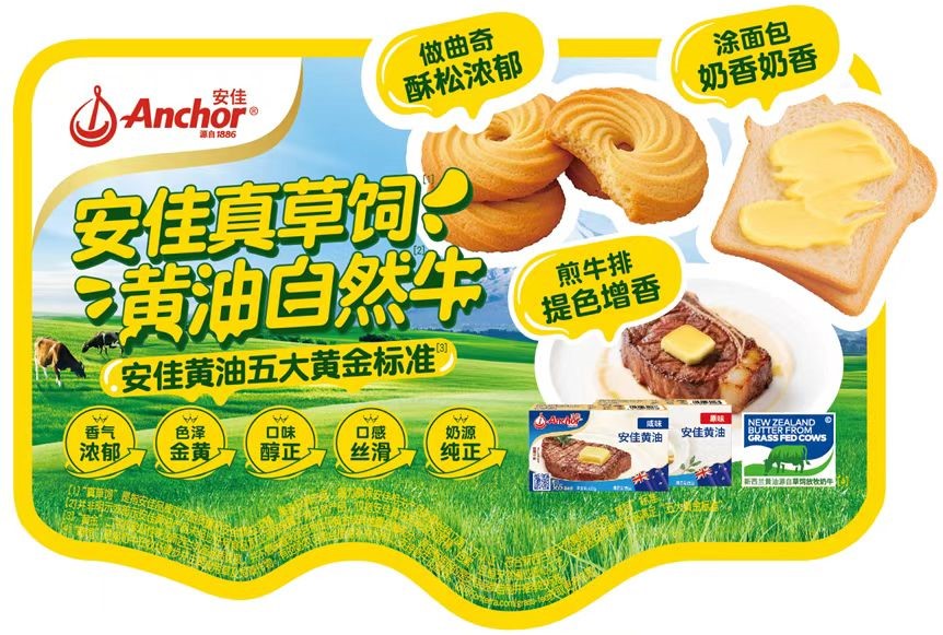 新西兰得天独厚的环境,孕育了全球稀有的优质天然草饲牧场。作为新西兰代表性乳企,恒天然牧场奶牛350天自由放养、96%食谱为自然牧草、全年享受2000小时阳光。优质牧场造就了恒天然奶源的高品质:更优质的蛋白质组成、更多的β胡萝卜素、更高的维生素d含量等。近期,安佳发布了“安佳真草饲,黄油自然牛,安佳黄油五大黄金标准”,强调“香气浓郁”、“色泽金黄”、“口味醇正”、“口感丝滑”、“奶源纯正”。(*关于描述中使用的概念和数据的具体解释,请查看“参考来源”部分)