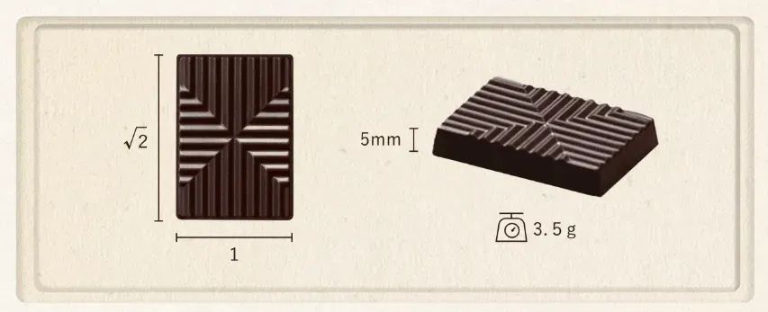 黄金比例的“the cacao(日语:ザ・カカオ)”巧克力块,短边为22毫米,厚度为5毫米