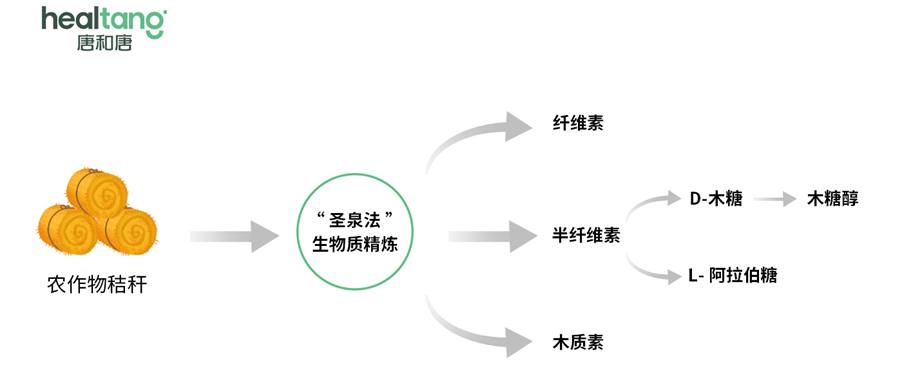 唐和唐依托圣泉集团研发的“圣泉法”生物质精炼一体化绿色技术,综合利用植物秸秆中的半纤维素,生产食品级l-阿拉伯糖和d-木糖,进一步使用d-木糖生产食品级木糖醇。该技术拥有自主知识产权,集聚245项专利技术,对玉米芯和秸秆等原料的利用率达95%以上,产出上百种产品。