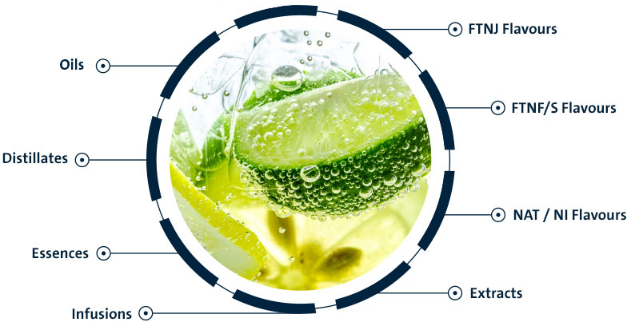 提取物、蒸馏液、高倍水相、高倍柑橘油、天然组分和各类香精 等。产品在味觉上提供清爽、酸甜、多汁的体验,并具备强烈且真实的柑橘香气与口味,独特的