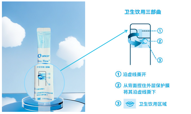 从消费场景的真实困扰出发,曾主导起草液体条包国家标准的安姆科,最新推出了kiss flow®清饮包,这款条包的饮用口外层覆盖了一层专利保护膜,让饮用口在被撕开的前后实现“细菌零接触”,让“安全直饮”真正落地。