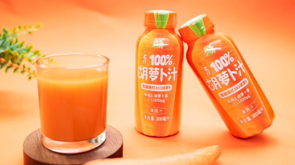 新鲜采摘的晋江“禧红202”胡萝卜,由盼盼以nfc非浓缩还原工艺,加工为100%天然果汁。