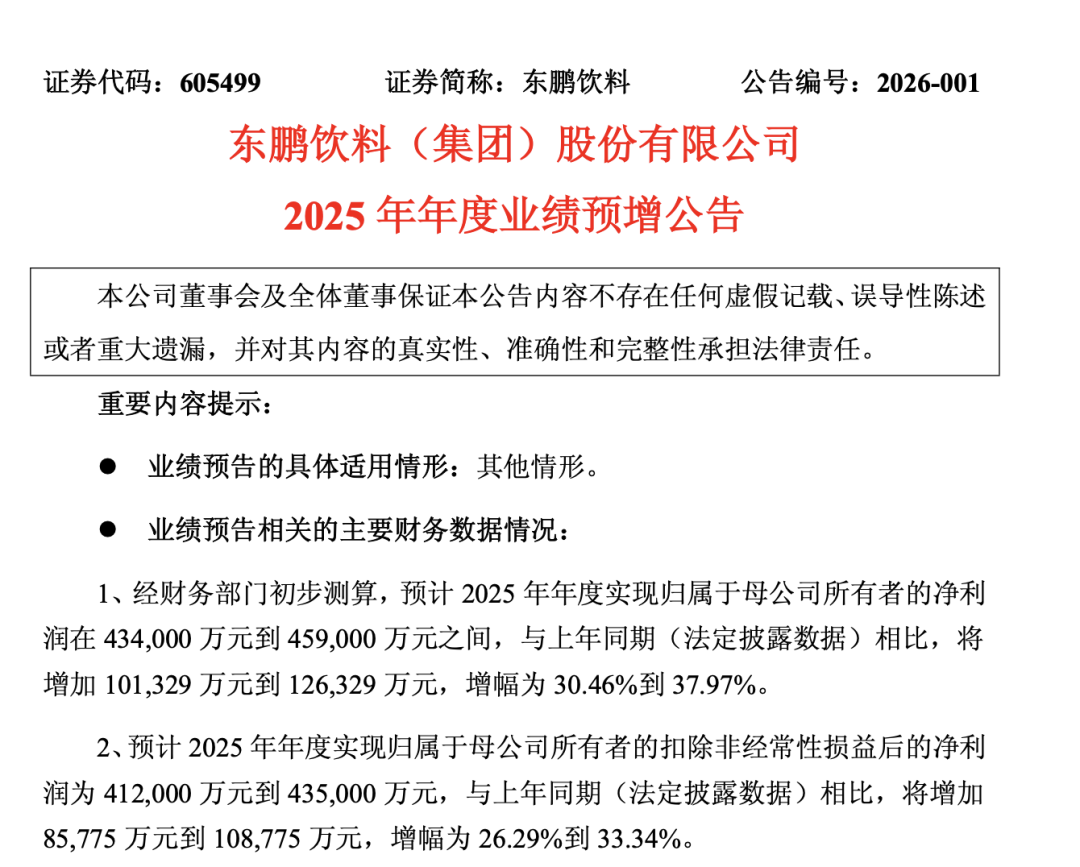 今天,东鹏饮料发布2025年度业绩预告,预计归属于母公司所有者的净利润为43.40亿元到45.90亿元,与上年同期相比增长30.46%-37.97%。